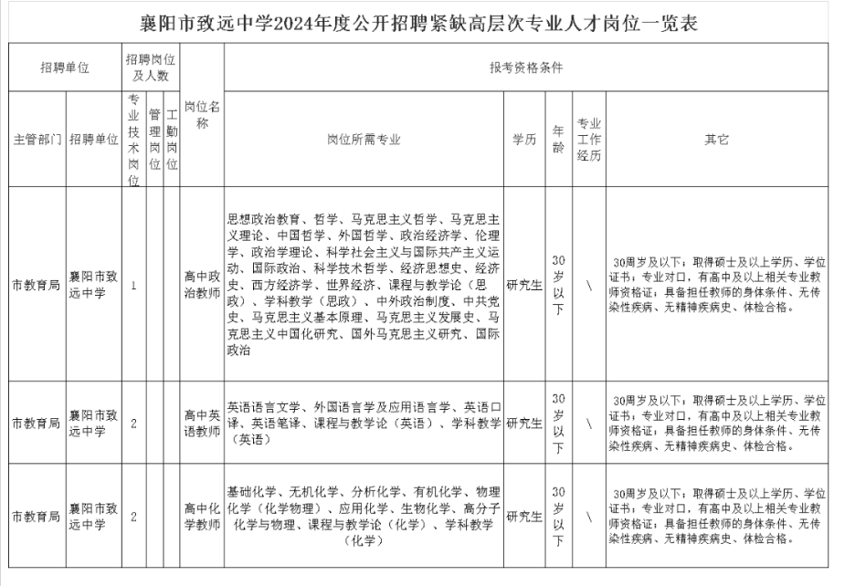 襄陽市致遠(yuǎn)中學(xué)2024年度公開招聘緊缺高層次專業(yè)人才公告