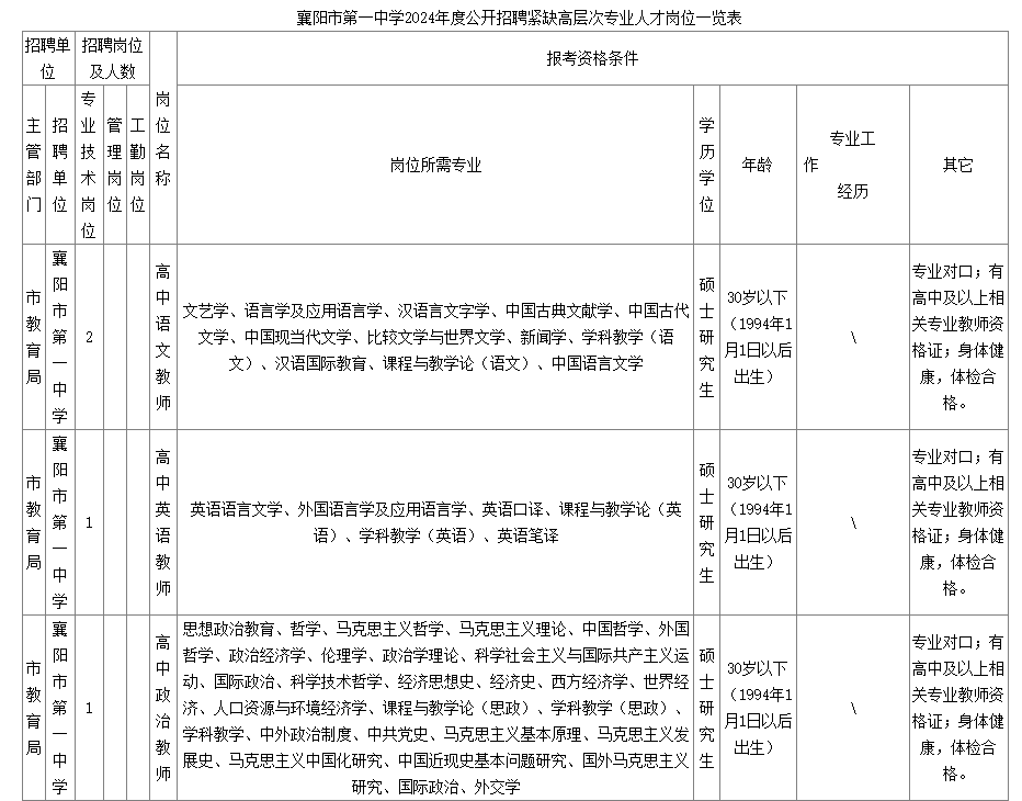 襄陽市第一中學2024年度公開招聘緊缺高層次專業(yè)人才公告