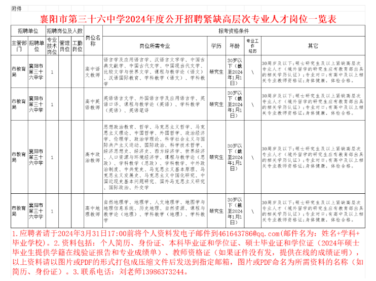 附件:《襄陽市第三十六中學(xué)2024年度公開招聘緊缺高層次專業(yè)人才崗位一覽表》