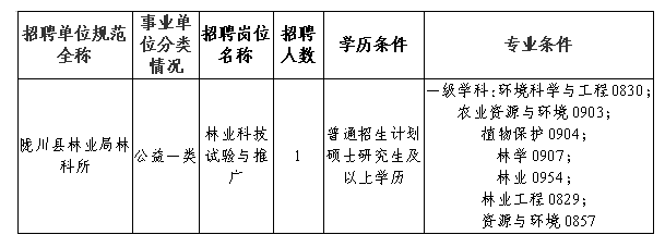 隴川縣林業(yè)局林科所專業(yè)技術(shù)人員1名,具體崗位及招聘條件等詳見下表。