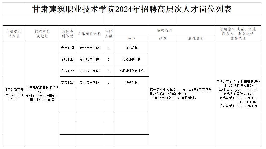 本次計(jì)劃招聘高層次人才4人,具體崗位及聯(lián)系方式見《甘肅建筑職業(yè)技術(shù)學(xué)院2024年公開考核招聘高層次專業(yè)及崗位列表》。