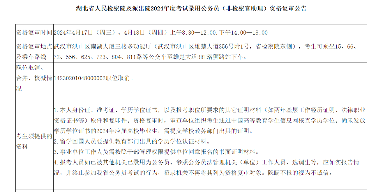 2024年湖北省人民檢察院及派出院公務(wù)員考試(非檢察官助理)資格復審公告