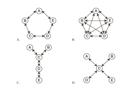 【答案】D【解析】第一步:找出定義要點。輪式網(wǎng)絡:“一個下級同時與多個主管聯(lián)系”、“主管之間沒有溝通的情形”;Y式網(wǎng)絡:“第二級有兩個上級與之聯(lián)系”、“第三級與一個或更多下級發(fā)生聯(lián)系”;環(huán)式網(wǎng)絡:“每個成員僅與相鄰者聯(lián)系”、“不能與更遠的成員進行溝通”;全通道式網(wǎng)絡:“所有成員間充分進行溝通”、“所有成員的地位是平等的,無核心人物”。第二步:逐一分析選項。A項:每個字符只與其相鄰的兩個字符間有聯(lián)系,與其他不相鄰的沒有聯(lián)系,符合“每個成員僅與相鄰者聯(lián)系”、“不能與更遠的成員進行溝通”,符合“環(huán)式網(wǎng)絡”定義,不符合“輪式網(wǎng)絡”定義,排除;B項:每個字符與其他所有字符都有聯(lián)系,而且無核心字符,符合“所有成員間充分進行溝通”、“所有成員的地位是平等的,無核心人物”,符合“全通道式網(wǎng)絡”定義,不符合“輪式網(wǎng)絡”定義,排除;C項:字符C分別與兩個上級字符A、B以及一個下級字符D有聯(lián)系,符合“第二級有兩個上級與之聯(lián)系”、“第三級與一個或更多下級發(fā)生聯(lián)系”,符合“Y式網(wǎng)絡”定義,不符合“輪式網(wǎng)絡”定義,排除;D項:字符C作為下屬時,分別與多個主管字符A、B、C、D有聯(lián)系,但是主管字符A、B、C、D之間沒有聯(lián)系,符合“一個下級同時與多個主管聯(lián)系”、“主管之間沒有溝通的情形”,符合“輪式網(wǎng)絡”定義,當選。