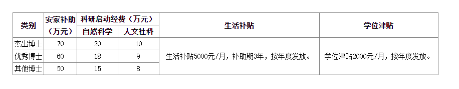 1.補貼政策。對引進的博士給予安家補助、科研啟動經(jīng)費、生活補貼、學(xué)位津貼等方面支持。安家補助分3年發(fā)放,每年發(fā)放三分之一。