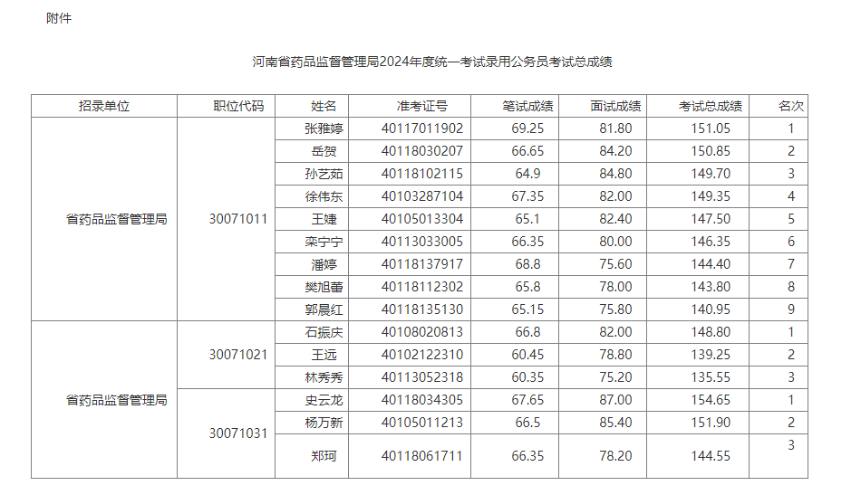 附件:河南省藥品監(jiān)督管理局2024年度統(tǒng)一考試錄用公務(wù)員考試總成績(jī)