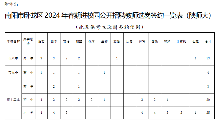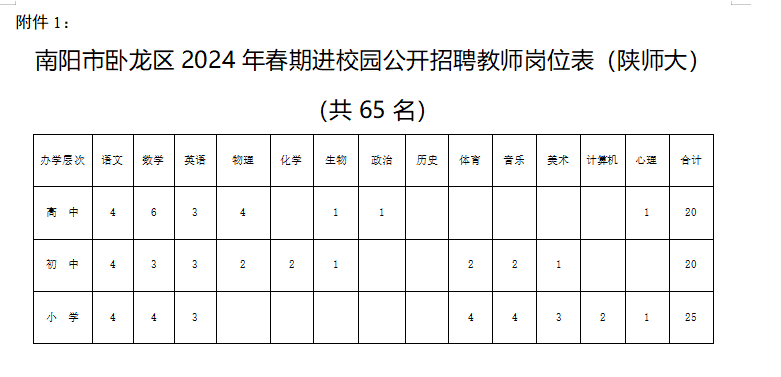 1、南陽市臥龍區(qū)2024年春期進校園公開招聘教師崗位表(陜師大)
