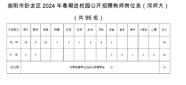 進(jìn)校園公開(kāi)招聘教師95名。具體崗位詳見(jiàn)《南陽(yáng)市臥龍區(qū)2024年春期進(jìn)校園公開(kāi)招聘教師崗位表》(附件1)。