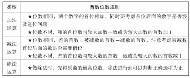 首數(shù)法是一種數(shù)學(xué)計(jì)算技巧,其核心在于通過(guò)觀察和分析數(shù)字的首位或前兩位來(lái)快速得出答案。這種方法特別適用于加法、減法或除法的運(yùn)算場(chǎng)景,尤其是在選項(xiàng)的首位或前兩位數(shù)字存在差異時(shí)。通過(guò)首數(shù)法,我們可以更加高效、準(zhǔn)確地找到正確答案。