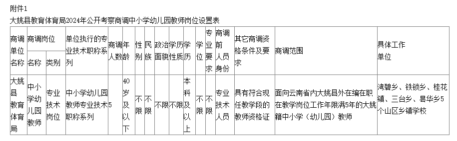 公開商調(diào)崗位詳見《大姚縣教育體育局2024年公開考察商調(diào)中小學(xué)幼兒園教師崗位設(shè)置表》(附件1)。