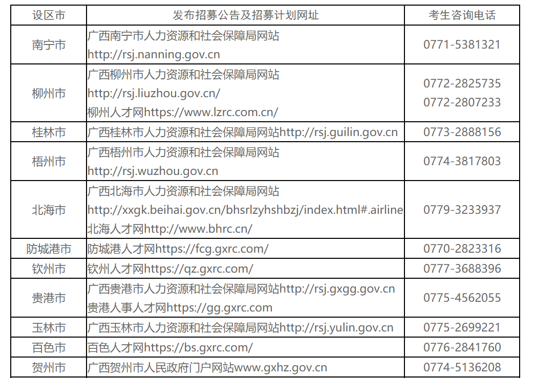 附件:廣西14個(gè)設(shè)區(qū)市發(fā)布招募公告網(wǎng)址及咨詢電話