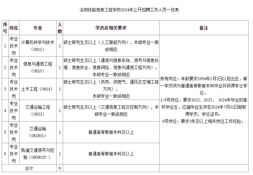 本次面向社會公開招聘工作人員6名,具體專業(yè)、人數(shù)等詳見《洛陽鐵路信息工程學(xué)校2024年公開招聘工作人員一覽表》(附件1)。