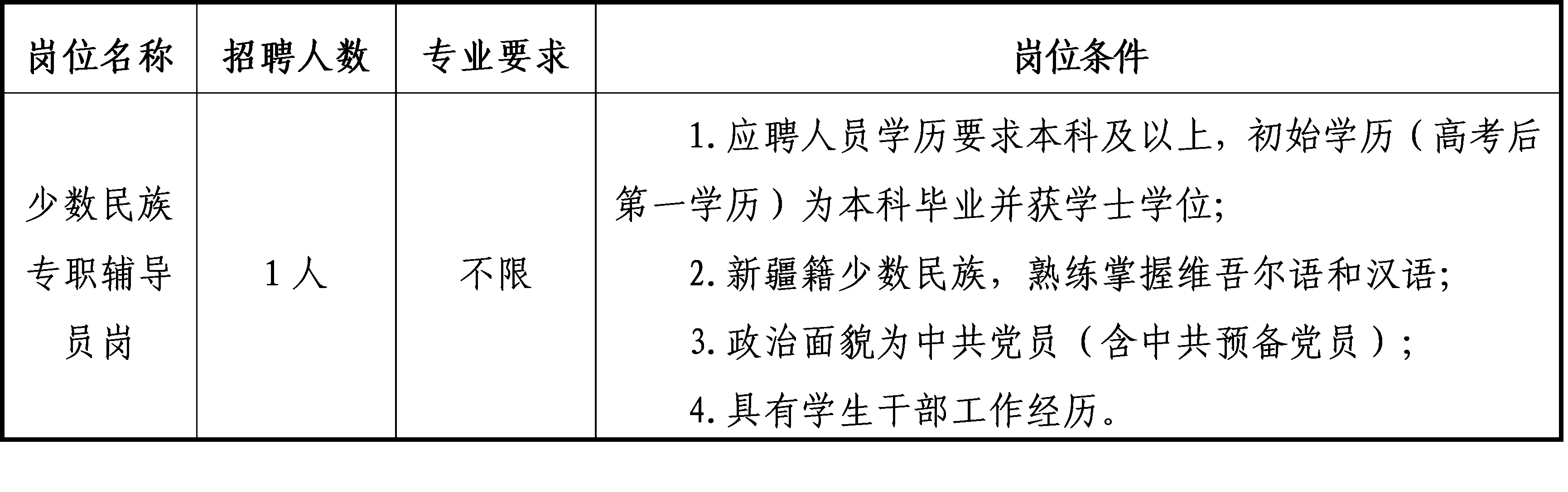 為滿足學(xué)校事業(yè)發(fā)展需要,結(jié)合實(shí)際,我校面向社會(huì)公開招聘少數(shù)民族專職輔導(dǎo)員1人,現(xiàn)將有關(guān)事項(xiàng)公告如下: