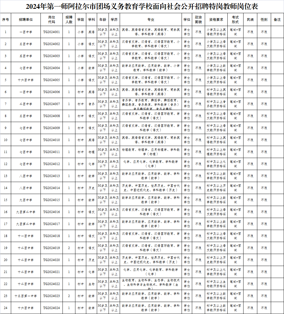 附件:1.2024年第一師阿拉爾市團(tuán)場(chǎng)義務(wù)教育學(xué)校面向社會(huì)公開招聘特崗教師崗位表