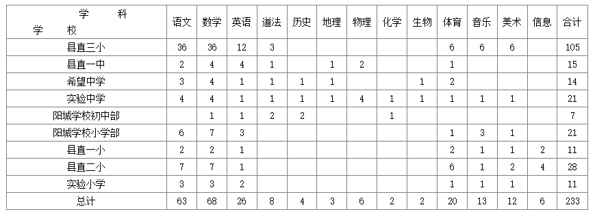 2024年公開選調(diào)縣內(nèi)教師共計(jì)233名。具體選調(diào)崗位名額分配如下: