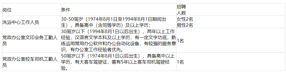 宿州職業(yè)技術學院委托安徽河川人力資源有限公司面向社會公開招聘洗浴中心工作人員4名、黨政辦公室文印會務工勤人員1名、黨政辦公室校車司機工勤人員1名。
