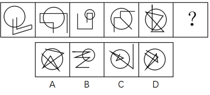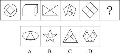 元素組成混亂,但題干與選項中每個圖形均出現(xiàn)了圓,優(yōu)先考慮圓內(nèi)外數(shù)量關系。圓內(nèi)點的數(shù)量分別為0,1,2,3,4,因此問號中圖形圓內(nèi)交點數(shù)量應該為5,觀察四個選項,圓內(nèi)交點數(shù)分別為4,2,5,8,只有C項符合,故答案為C。