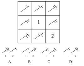 九宮格優(yōu)先橫著看(本題豎著看可用同樣的規(guī)律解題),第一行中圖一與圖二完整疊加(從第二行驗證可得不是去同存異)后可以得到圖三,第二行圖一與1完整疊加后得到圖三,由題干可知圖一與圖三完全一致,故1中不應該出現(xiàn)圖一中沒有的線段,排除A。第三行,圖一與圖二完整疊加后得到2,故答案為D。