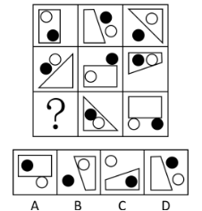 元素組成相似,九宮格每行都有黑白圓,還有一個長方形、一個梯形、一個三角形,因此第三行中還缺少一個梯形,排除A項。對比B、C、D三項,發(fā)現(xiàn)黑白圓所處位置不同,觀察題干黑白圓位置,發(fā)現(xiàn)每行黑白圓所處位置有三種:都在多邊形內(nèi)部,都在多邊形外部,白圓在多邊形內(nèi)部黑圓在外部,第三行還缺少一內(nèi)一外的情況,因此問號處圖形應該為白圓在內(nèi)部,黑圓在外部,故答案為B。