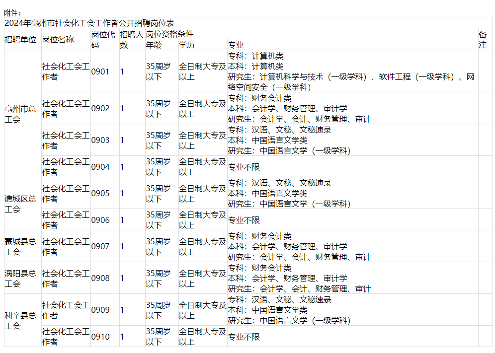 2024年亳州市社會(huì)化工會(huì)工作者公開招聘崗位表