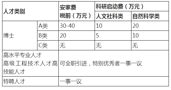具有博士研究生學歷學位,年齡一般不超過40周歲(特別優(yōu)秀者可放寬至45周歲)。經(jīng)人才評估,確定為A、B、C類,可享受相應待遇。