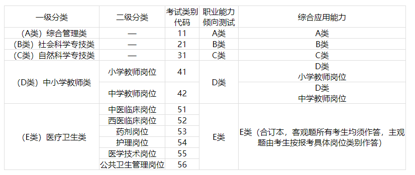 不同類型的招聘崗位使用不同的筆試試題,試題按崗位類別分為綜合管理類(A類)、社會科學專技類(B類)、自然科學專技類(C類)、中小學教師類(D類)和醫(yī)療衛(wèi)生類(E類)五個考試類別。