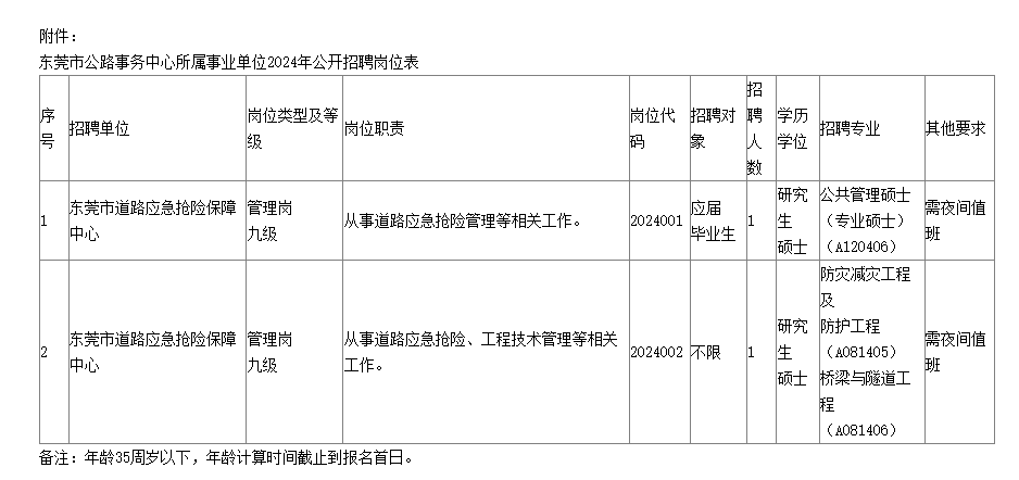 具體的招聘單位、崗位、人數(shù)和資格條件見《東莞市公路事務中心所屬事業(yè)單位2024年公開招聘崗位表》(附件)。