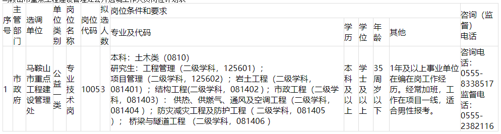 馬鞍山市重點工程建設(shè)管理處公開選調(diào)工作人員崗位計劃表