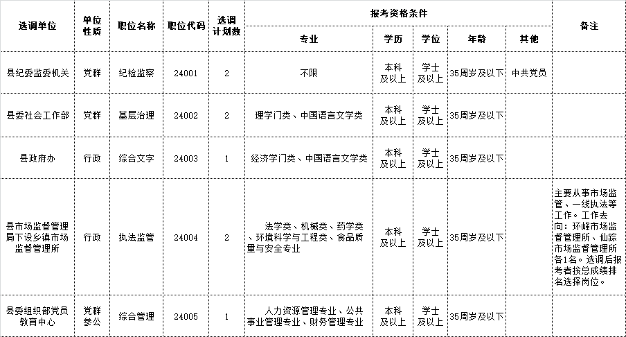 本次計(jì)劃選調(diào)8名公務(wù)員(參照公務(wù)員法管理單位工作人員),詳見(jiàn)《含山縣2024年縣直機(jī)關(guān)公開(kāi)選調(diào)公務(wù)員職位表》(附件1)。