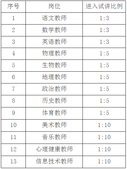 若實(shí)際參加考核人數(shù)與招聘人數(shù)超過(guò)“進(jìn)入試講比例”的崗位(具體比例見下表),先進(jìn)行面試,根據(jù)面試成績(jī)按該比例確定進(jìn)入試講人員,面試成績(jī)不計(jì)入綜合成績(jī);未超過(guò)該比例的崗位,全部資格審查合格人員進(jìn)行試講。試講成績(jī)=綜合成績(jī)。