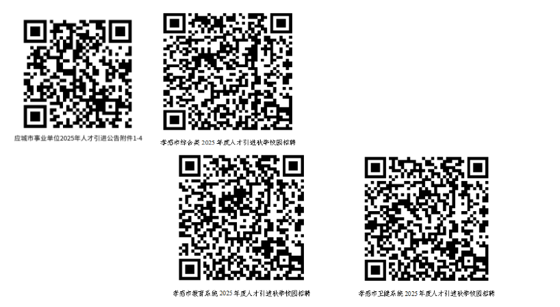 應(yīng)聘人員請于2024年11月11日(周一)9:00至12月10日(周二)16:00期間,結(jié)合自己所學(xué)專業(yè)和報考意向崗位,報考綜合類崗位的掃碼登錄“孝感市綜合類2025年度人才引進(jìn)秋季校園招聘”報名系統(tǒng)(https://ks.jobhb.com/wsbm/sys-list-hb?fcode=2025xgzhlgw)、報考教育系統(tǒng)崗位的掃碼登錄“孝感市教育系統(tǒng)2025年度人才引進(jìn)秋季校園招聘”報名系統(tǒng)(https://ks.jobhb.com/wsbm/sys-list-hb?fcode=2025xgwj)、報考衛(wèi)健系統(tǒng)崗位的掃碼登錄“孝感市衛(wèi)健系統(tǒng)2025年度人才引進(jìn)秋季校園招聘”報名系統(tǒng)(https://ks.jobhb.com/wsbm/sys-list-hb?fcode=2025xgjy),進(jìn)行網(wǎng)上注冊,設(shè)置個人密碼,提交報名申請。每名應(yīng)聘人員在孝感市范圍內(nèi)限報一個崗位。