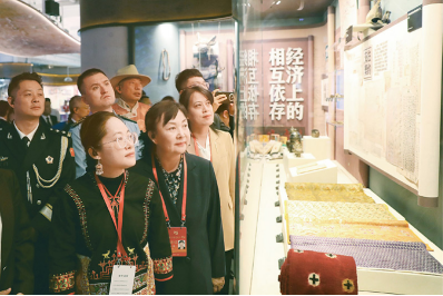 2024年9月28日至10月1日,全國(guó)少數(shù)民族參觀團(tuán)在北京參觀考察,感受新時(shí)代偉大成就。圖為參觀團(tuán)在民族文化宮參觀鑄牢中華民族共同體意識(shí)文物古籍展,了解中華民族共同體形成發(fā)展的歷史。民族畫報(bào)社供圖 陳濤/攝