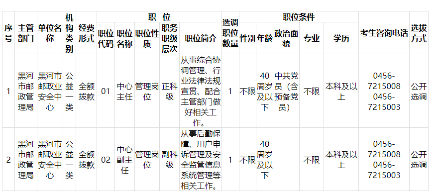 2024年黑河市郵政業(yè)安全中心公開選調(diào)工作人員職位計劃表