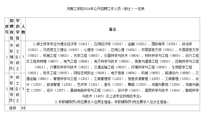 根據(jù)我校專業(yè)技術(shù)人員崗位空缺情況和學校發(fā)展需要,擬招聘碩士畢業(yè)生12名。招聘專業(yè)及計劃見附件《河南工學院2024年公開招聘工作人員(碩士)一覽表》(以國務(wù)院學位委員會、教育部印發(fā)的《研究生教育學科專業(yè)目錄(2022年)》為準,學科括號內(nèi)的專業(yè)方向僅為招聘崗位條件要求,不作為資格審核依據(jù))。