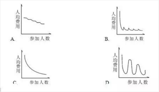 【例題】某學(xué)校組織學(xué)生春游,往返目的地時租用可乘坐10名乘客的面包車,每輛面包車往返的租金為250元。此外,每名學(xué)生的景點(diǎn)門票和午餐費(fèi)用為40元,如果求盡可能少租車,則以下哪個圖形最能反映平均每名學(xué)生的春游費(fèi)用支出與參加人數(shù)之間的關(guān)系?( )
