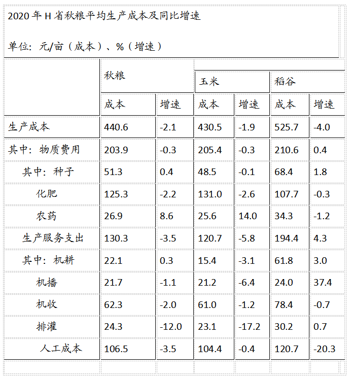 2020年,H省秋糧玉米和稻谷的市場(chǎng)平均交易價(jià)格分別為2.34元/公斤和2.74元/公斤,分別比上年上漲28.6%和8.7%。按此價(jià)格測(cè)算,2020年全省農(nóng)戶種植玉米、稻谷扣除成本前的產(chǎn)值分別為957.1元/畝、1520.7元/畝,分別比上年增長(zhǎng)33.4%、8.9%。