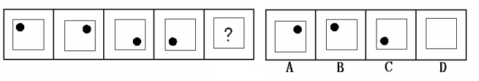 ?。ù鸢福築。黑點(diǎn)在正方形中順時(shí)針移動(dòng)。在第5個(gè)圖形中,應(yīng)該正好移動(dòng)到左上角。)
