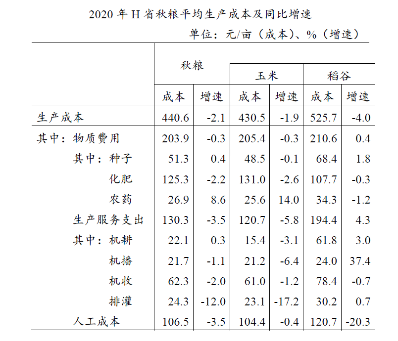 2020年,H省秋糧玉米和稻谷的市場平均交易價格分別為2.34元/公斤和2.74元/公斤,分別比上年上漲28.6%和8.7%。按此價格測算,2020年全省農(nóng)戶種植玉米、稻谷扣除成本前的產(chǎn)值分別為957.1元/畝、1520.7元/畝,分別比上年增長33.4%、8.9%。