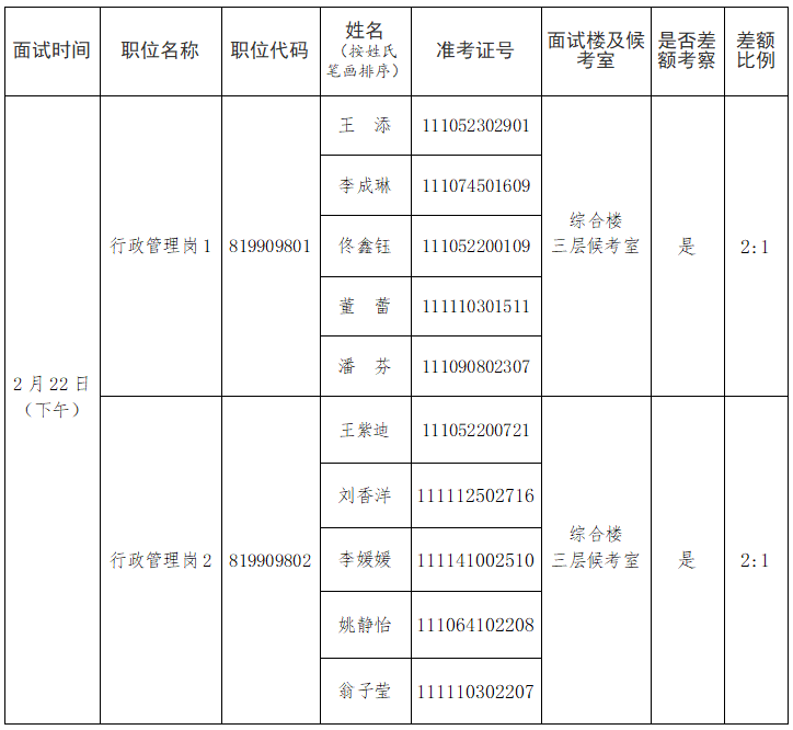 面試簽到時(shí)間為面試當(dāng)天下午12:30至13:00,13:00停止簽到入場(chǎng),請(qǐng)考生務(wù)必按照本人參加面試的場(chǎng)次安排,提前到相應(yīng)面試樓前集合等待簽到。入闈封閉管理時(shí)間為本人面試當(dāng)天下午13:00,入闈封閉管理前,未到達(dá)面試樓完成簽到的,視為自動(dòng)放棄。