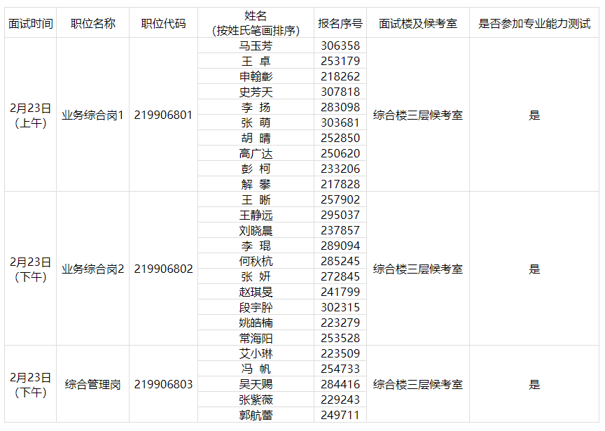 面試簽到時(shí)間為面試當(dāng)天上午7:30至8:00或下午12:30至13:00,8:00或13:00停止簽到入場(chǎng),請(qǐng)考生務(wù)必按照本人參加面試的場(chǎng)次安排,提前到相應(yīng)面試樓前集合等待簽到。入闈封閉管理時(shí)間為本人面試當(dāng)天上午8:00或下午13:00,入闈封閉管理前,未到達(dá)面試樓完成簽到的,視為自動(dòng)放棄。