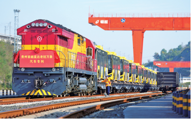 圖為2024年10月28日,裝載“貴州造”新能源客車(chē)的出口專列??吭谫F陽(yáng)國(guó)際陸港都拉營(yíng)站。新華社記者 劉續(xù)/攝