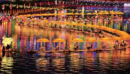 蛇年春節(jié),全國(guó)各地張燈結(jié)彩,人們參加各種喜慶活動(dòng),紅紅火火迎新春。圖為2025年1月21日晚,游客在湖北省宣恩縣貢水河中乘坐竹筏賞夜景。新華社發(fā) 宋文/攝