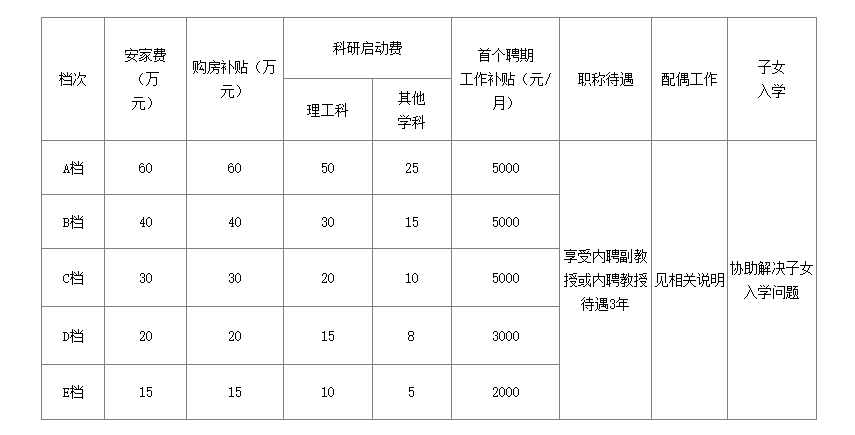 配偶工作安排說明:根據(jù)博士要求和配偶的具體情況,幫助解決配偶工作,博士配偶年齡男需在45歲以下、女需在40歲以下。博士配偶需為普通高等院校畢業(yè)的本科畢業(yè)生(要求取得本科學(xué)歷、學(xué)士學(xué)位),符合地方政府人事代理政策者,按人事代理人員安排;博士配偶符合公開招聘條件的,可按當(dāng)年公開招聘政策和程序參加公開招聘。符合C檔以上條件引進(jìn)的博士,配偶需為全日制本科學(xué)歷。按D檔、E檔條件引進(jìn)的博士,配偶需為普通高等院校畢業(yè)的碩士畢業(yè)生(要求取得研究生學(xué)歷、碩士學(xué)位)方可按人事代理人員安排。高層次人才由于個(gè)人原因離開學(xué)校,其經(jīng)學(xué)校內(nèi)部安排工作的配偶須同時(shí)離開學(xué)校;在特殊待遇期內(nèi)離婚者,學(xué)校將解除經(jīng)學(xué)校安排工作的配偶的工作關(guān)系。