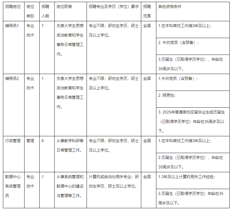 輔導員崗的筆試內(nèi)容為高等教育學、教師倫理學、大學心理學、高等教育法規(guī)基礎等專業(yè)知識;行政管理崗位的筆試內(nèi)容為綜合基礎知識;數(shù)據(jù)中心系統(tǒng)管理員的筆試內(nèi)容為綜合基礎知識和崗位所必須具備的專業(yè)知識。