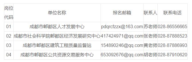 成都市郫都區(qū)委組織部下屬事業(yè)單位區(qū)人才發(fā)展中心引進(jìn)1名事業(yè)人員;成都市郫都區(qū)委政研室下屬事業(yè)單位成都市社會科學(xué)院郫都區(qū)經(jīng)濟(jì)發(fā)展研究中心引進(jìn)1名事業(yè)人員;成都市郫都區(qū)住建局下屬事業(yè)單位區(qū)建筑工程質(zhì)量監(jiān)督站引進(jìn)3名事業(yè)人員;成都市郫都區(qū)政府直屬事業(yè)單位區(qū)公共資源交易服務(wù)中心引進(jìn)1名事業(yè)人員。