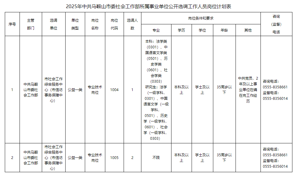 附件:2025年中共馬鞍山市委社會工作部所屬事業(yè)單位公開選調(diào)工作人員崗位計(jì)劃表