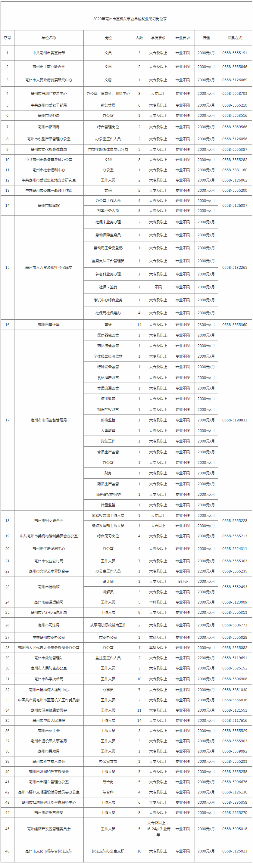 經(jīng)崗位征集審核,現(xiàn)將2020年市直黨政機(jī)關(guān)、事業(yè)單位(含公益一類(lèi)、參公管理事業(yè)單位)就業(yè)見(jiàn)習(xí)崗位(詳見(jiàn)附件),招募就業(yè)見(jiàn)習(xí)崗位等信息于本公告發(fā)布之日起同步在亳州市人力資源和社會(huì)保障局網(wǎng)、亳州公共招聘網(wǎng)統(tǒng)一發(fā)布。