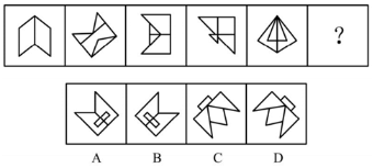 【解析】答案:D。第一組三幅圖,每幅圖中的兩個(gè)小圖形對(duì)稱軸相互垂直。第二組三幅圖,每幅圖兩個(gè)小圖形對(duì)稱軸相互平行。選項(xiàng)中只有D項(xiàng)兩個(gè)小圖形對(duì)稱軸相互平行,可選。