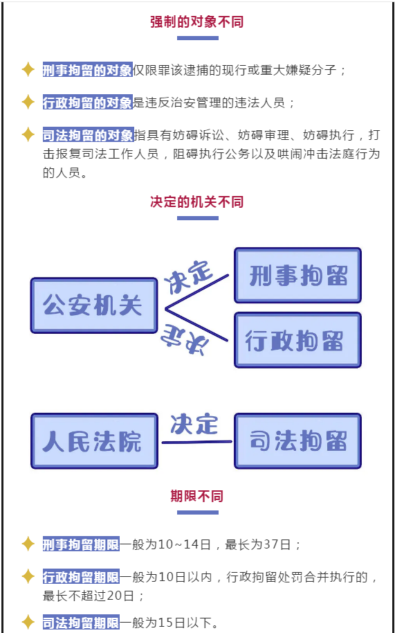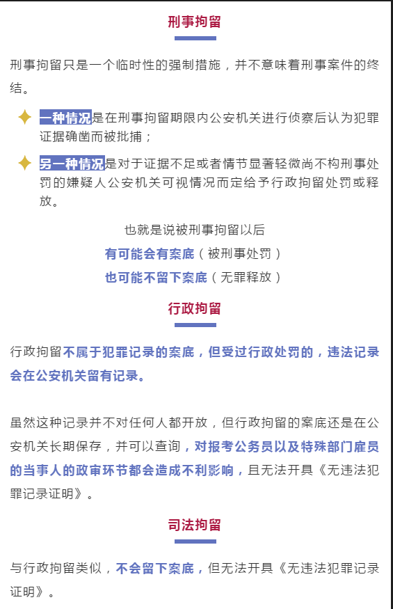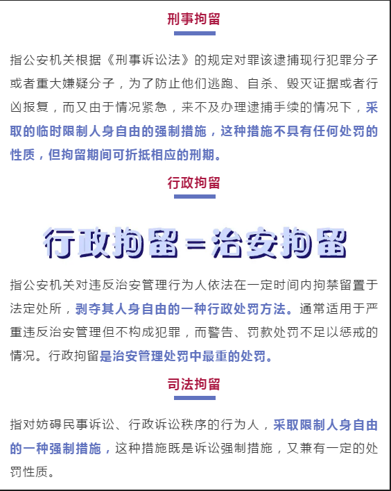 那么問題就來了,關于行政拘留你了解多少呢?行政、刑事、司法三種拘留,這三種拘留有什么區(qū)別?哪種拘留會留下案底呢?今天一次全講清楚了!