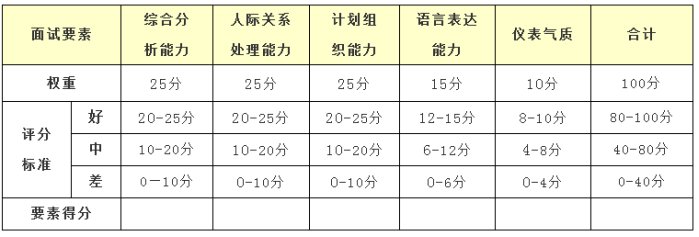 面試采用百分制計分,采取每個測評要素去掉一個最高分、一個最低分后綜合計算平均成績的辦法,確定報考人員面試成績,面試成績在本場面試結(jié)束后向面試人員公布。成績均保留兩位小數(shù),尾數(shù)四舍五入。