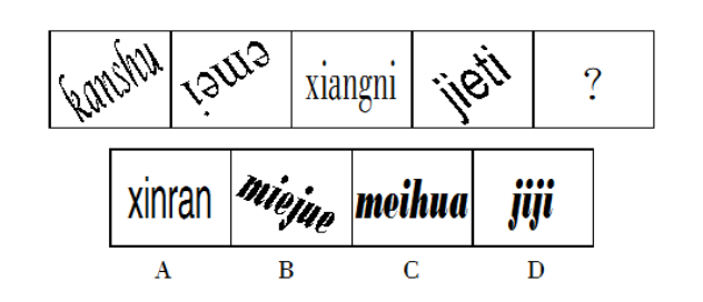 【解析】B。觀察已知字母發(fā)現(xiàn),每組字母中均有字母“a”,并且每個單詞中的“a”字母的位置依次在第1、2、3、4位,下一個應(yīng)該在第5位,因此答案選B。